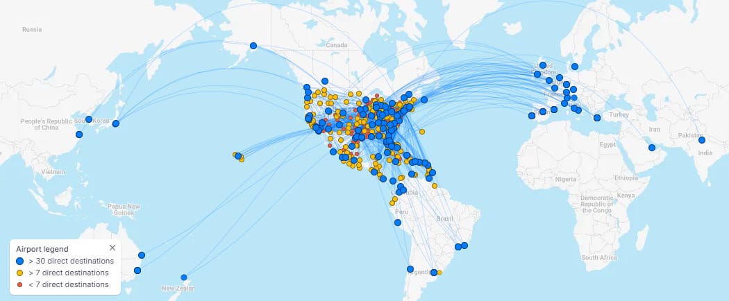 Hub Strength: American’s Dallas/Fort Worth hub is the largest in its network and provides unmatched connectivity for transcontinental and Latin American traffic. Charlotte offers the strongest network for East Coast to Latin America connections.